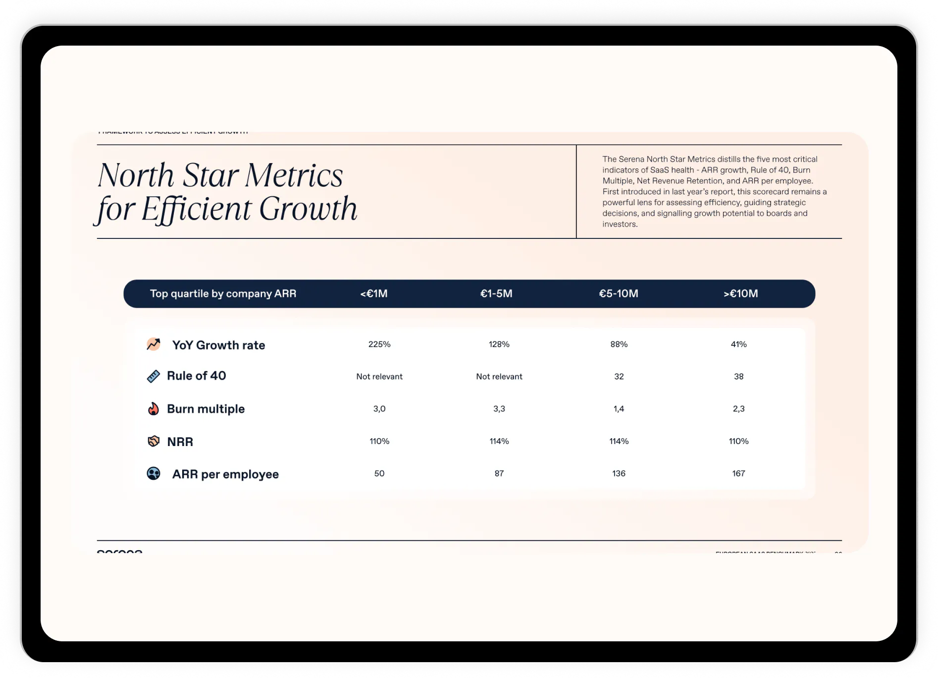 Compare your metrics to 800+ European SaaS companies across the five signals that now define performance: YoY Growth, Rule of 40, Burn Multiple, NRR, and ARR per Employee - with stage-by - stage benchmarks from Pre-Seed to €20M+ ARR.